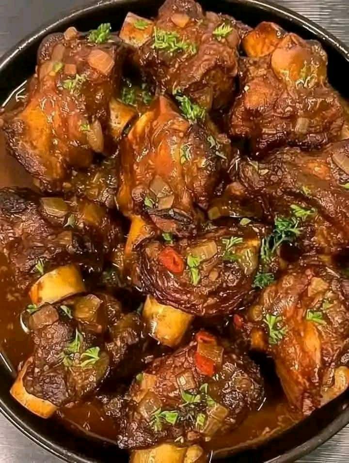 IntroductionSavory braised oxtails are a dish that embodies comfort and depth of flavor. Slow-cooked to perfection, oxtails become tender and juicy.infused with rich, aromatic herbs and spices. This recipe highlights the natural flavors of the meat while creating a luxurious, herb-infused sauce that elevates the dish.Ingredients2 to 3 pounds of oxtails, trimmed1 tablespoon vegetable oil1 large onion, chopped3 cloves garlic, minced2 medium carrots, sliced2 celery stalks, chopped1 cup red wine3 cups beef broth1 tablespoon tomato paste2 sprigs fresh thyme2 bay leavesSalt and freshly ground black pepper, to tasteFresh parsley, chopped, for garnishInstructionsStart by heating the vegetable oil in a large Dutch oven or heavy-bottomed pot over medium-high heat. Add the oxtails in batches, searing each side until browned.Remove the oxtails and set them aside. In the same pot, add the chopped onion, carrots, and celery. Sauté the vegetables for about 5 minutes, or until they soften and start to caramelize.Add the garlic and cook for another 1-2 minutes, until fragrant. Stir in the tomato paste and let it cook for an additional 2 minutes, allowing the paste to deepen in color.Pour in the red wine, scraping up any browned bits from the bottom of the pot with a wooden spoon. Allow the wine to reduce by half, which should take about 5 minutes.Return the oxtails to the pot, nestling them into the vegetables and sauce. Pour in the beef broth, ensuring the oxtails are mostly covered. Add the thyme and bay leaves.then bring the mixture to a simmer. Once it starts simmering, cover the pot and reduce the heat to low, letting it braise for 3 to 4 hours. During this time, the oxtails will become tender and flavorful.After the braising time is complete, remove the oxtails from the pot and set them aside. Discard the thyme sprigs and bay leaves.Using an immersion blender or a regular blender, puree the sauce until it reaches a smooth consistency.If the sauce is too thin, let it simmer uncovered for an additional 10 to 15 minutes to thicken.Taste the sauce and adjust seasoning with salt and pepper as needed.